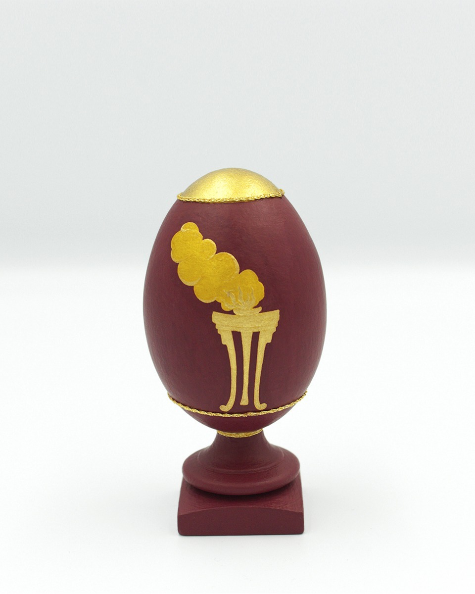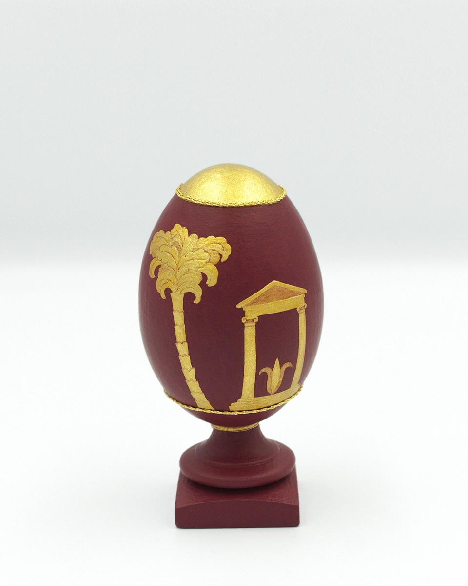 This Egyptian artifact’s inspired eggshell, Aegyptus XIX depicts a palm tree, a temple and a shrine. It is part of the collection Kyanomorpha of hand-painted eggs.
