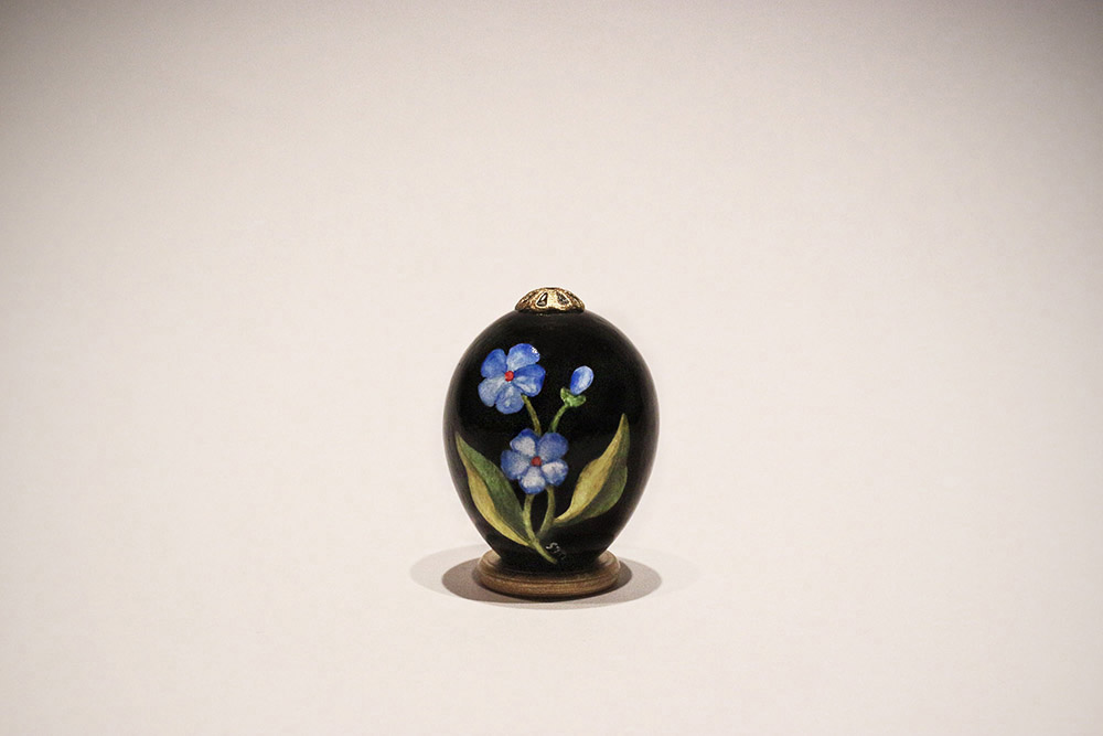 The design is inspired by a pietra dura motif. The egg is glued and standing on a bronze ring and presented on a miniature acrylic box. It is sealed with a coat of crystal clear UV resistant varnish.