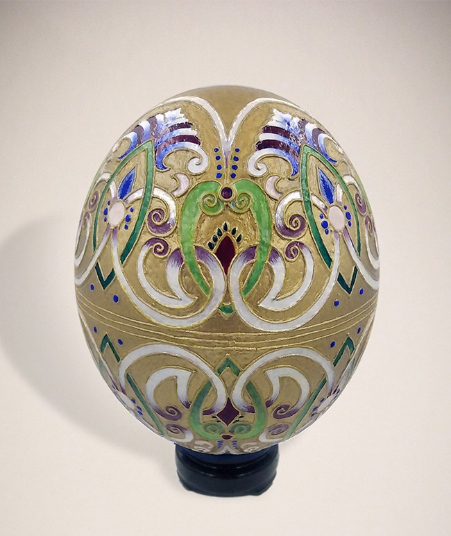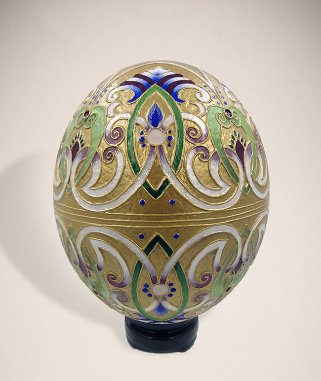 Cloisonné gold and enameled ritual table objects, that once adorned the big houses of the East, inspired this design. Simple stand from turned wood.