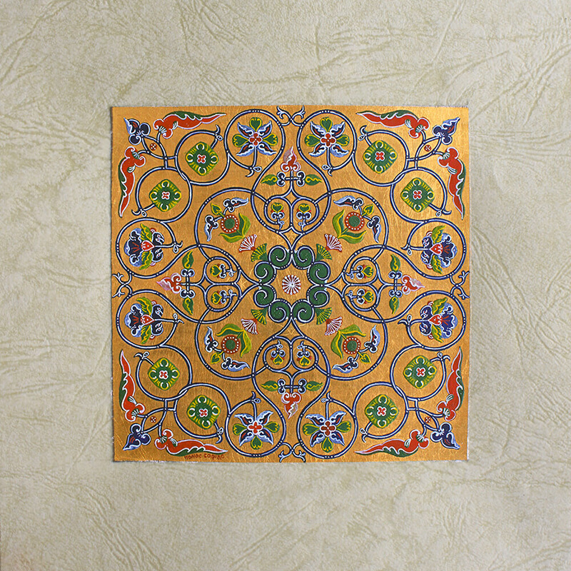 The egg-tempera with natural pigments is applied over faux gold leaf on gesso. The premium paper imitates vellum. It is sealed with two coats of waterbased mat varnish.