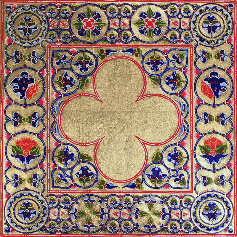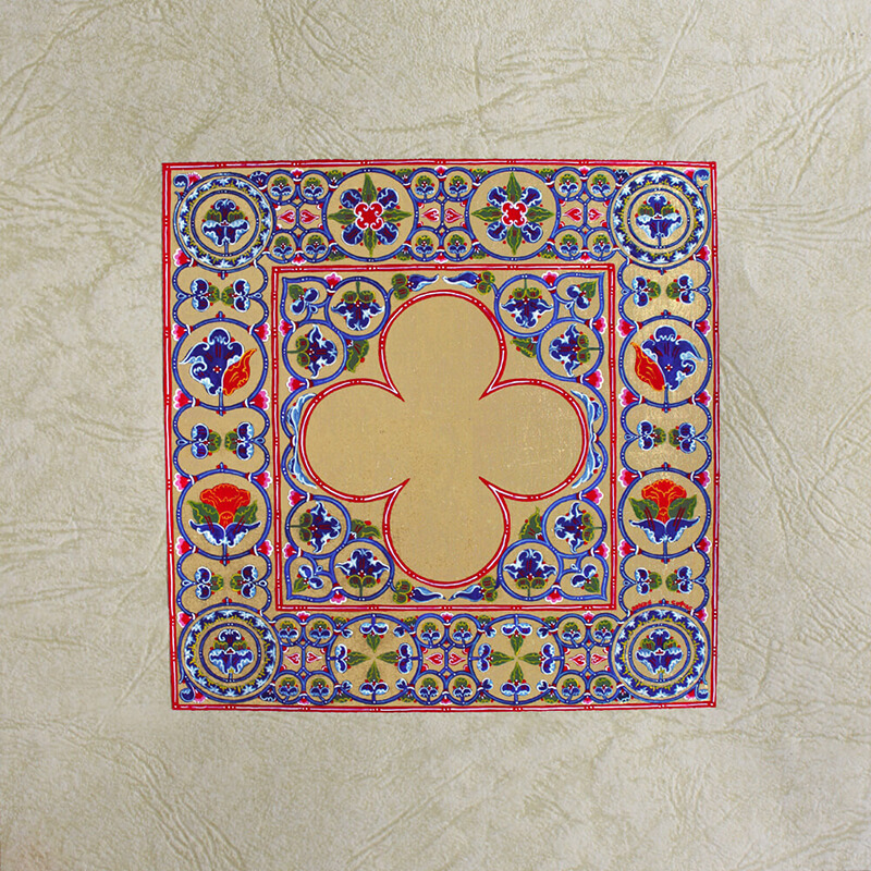 Folliage, flowers and scrolls with central oval cross; design inspired by byzantine religious manuscripts.