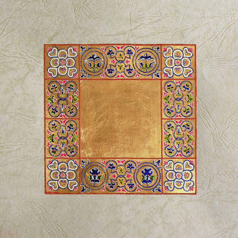 Leaf patterns and scrolls formatting a broad border of a gold square; dominant white colour on the four corner patterns. Design inspired by byzantine religious manuscripts.