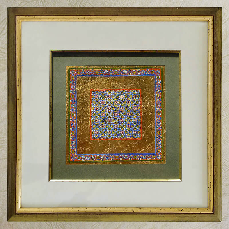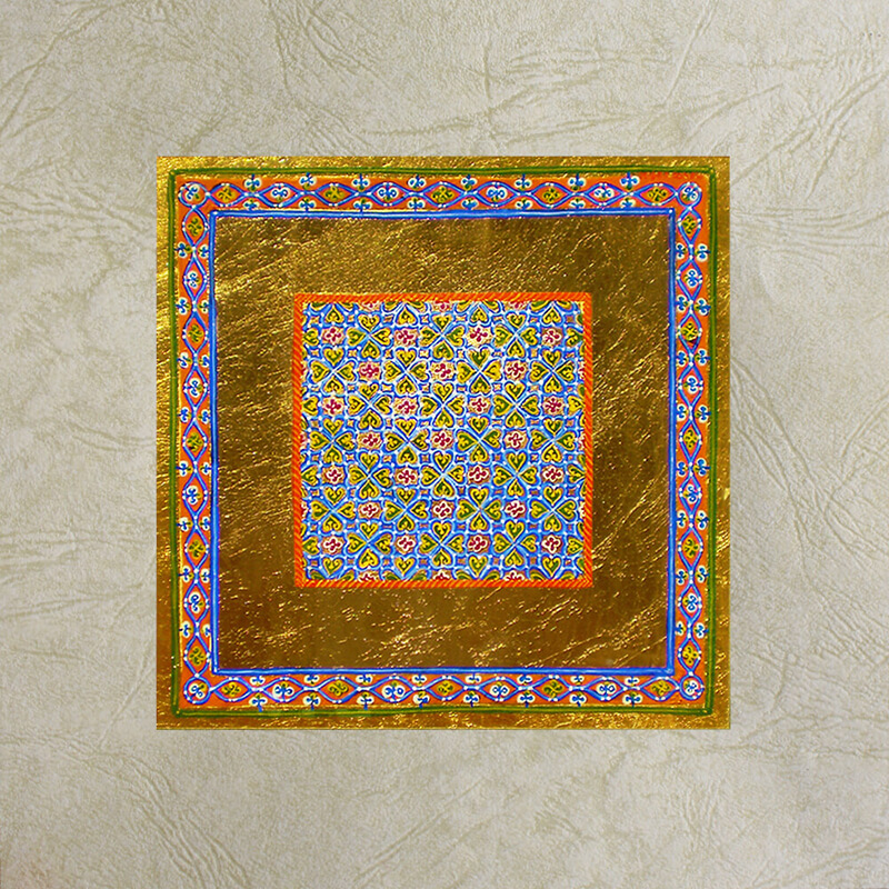 The egg-tempera with natural pigments is applied over faux gold leaf on gesso. The premium paper imitates vellum. It is sealed with two coats of waterbased mat varnish.