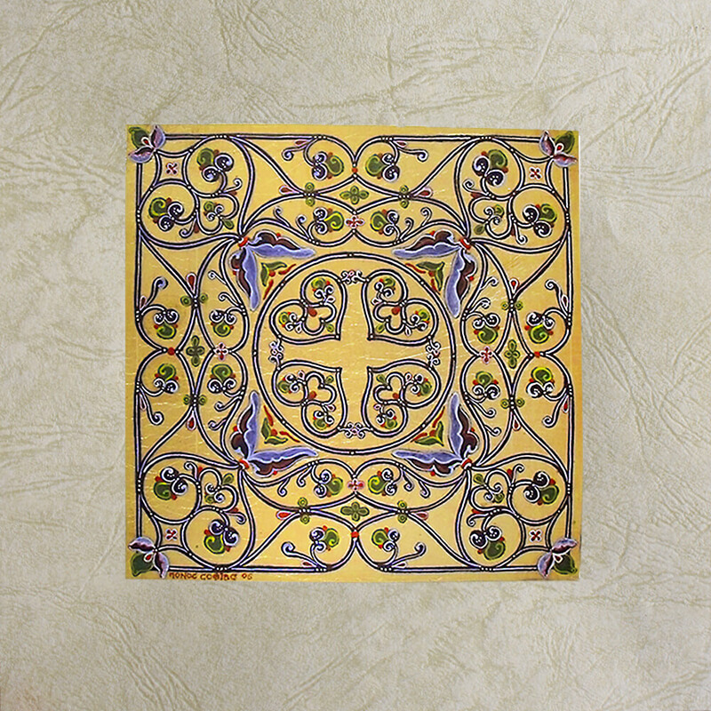 The egg-tempera with natural pigments is applied over real gold leaf on gesso. The premium paper imitates vellum. It is sealed with two coats of waterbased mat varnish.