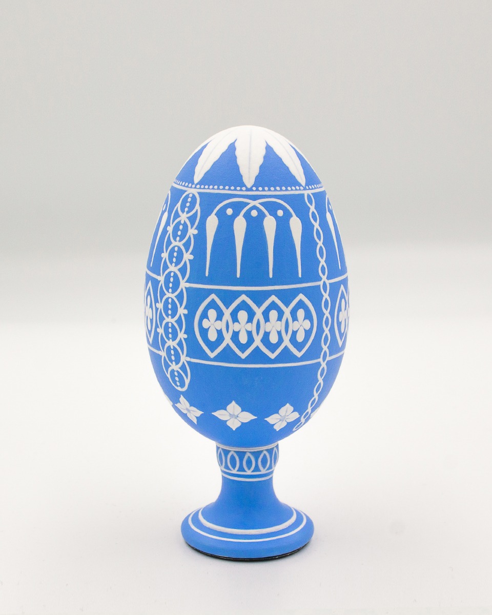 Crossing belongs to the collection Kyanomorpha of painted eggs. On this goose egg painted with acrylics, symmetrical floral patterns interweave with geometrical decorations.