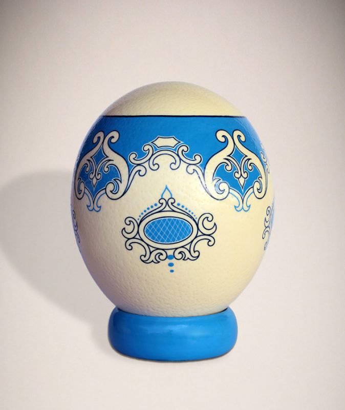 The design is inspired by a Delft blue pattern. The egg is free standing on a blue cylindrical base. It is sealed with a coat of crystal clear UV resistant varnish, only on the painted surface.
