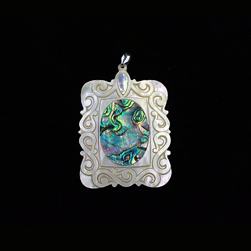 A hand-carved with scrolling motifs mother-of-pearl piece framing inlays of paua shell and abalone.