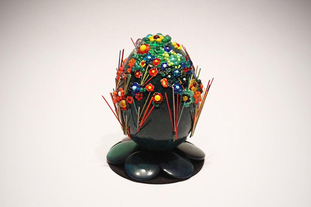 The tiny glass drops and needles that are glued meticulously upon the eggshell, were bought in Germany in the 1950’s. The design is inspired by an impressionist painting of a garden. The egg is secured and standing on vintage green vinul buttons.