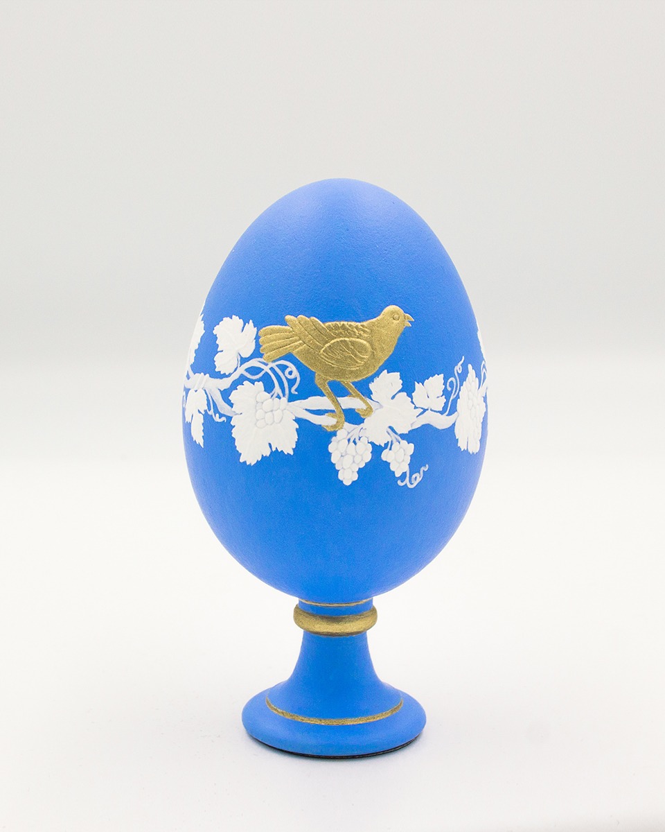 Golden finch belongs to the collection Kyanomorpha of miniature art eggs. This hand-painted goose egg depicts a golden bird singing on an grape vine garland and it is painted with acrylics.