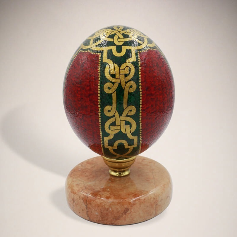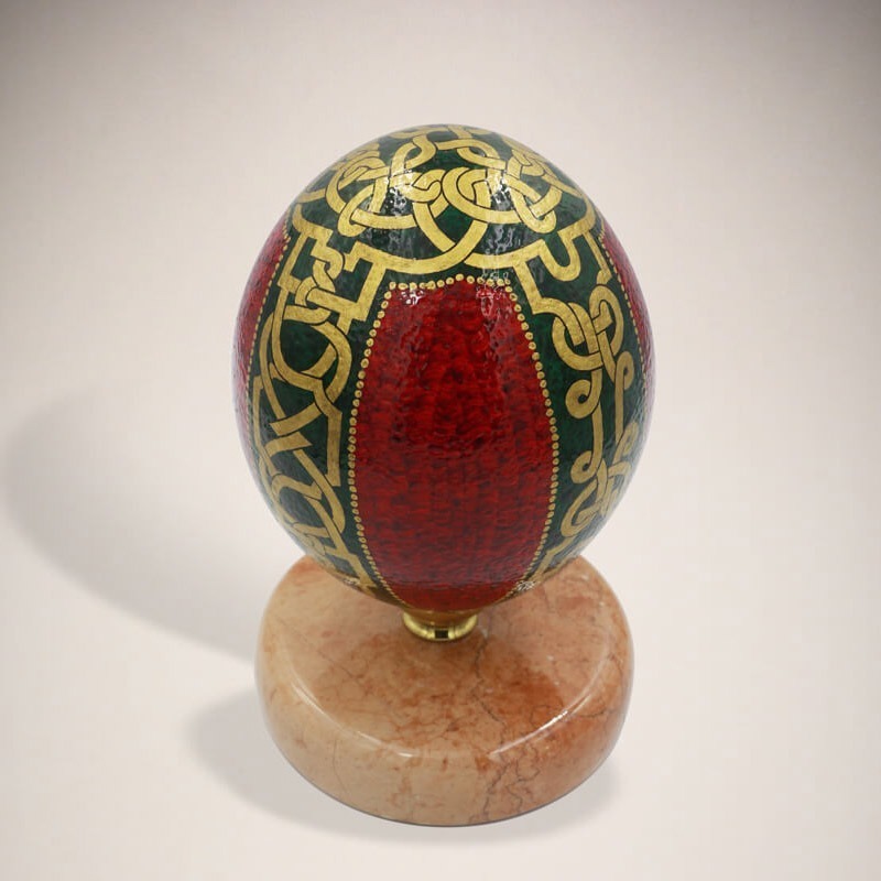 Ostrich egg decorated with celtic knots in gold tempera and cold enamels background. The egg is mounted on a precious red marble base. It is sealed with a coat of crystal clear UV resistant varnish.