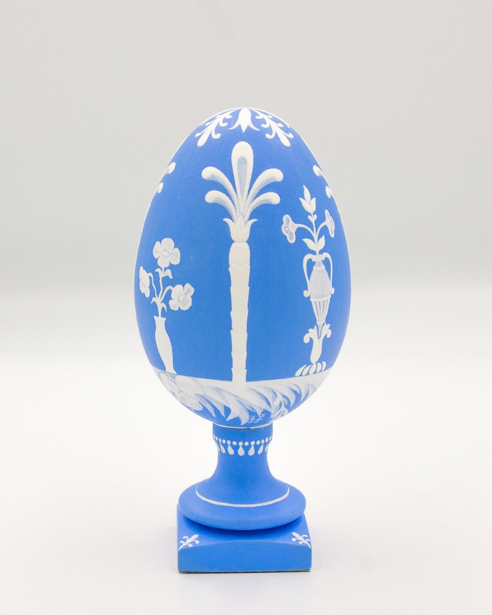 Hera’s garden belongs to the collection Kyanomorpha of painted eggs. This hand painted goose egg depicts palm trees and flowers on Greek vases.