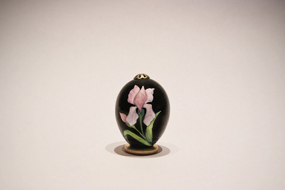 The design is inspired by a pietra-dura motif. The egg is secured on a bronze ring and presented in a miniature acrylic box. It is sealed with a coat of crystal clear UV resistant varnish.
