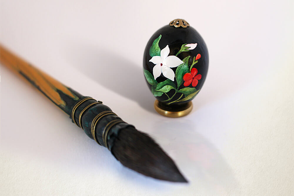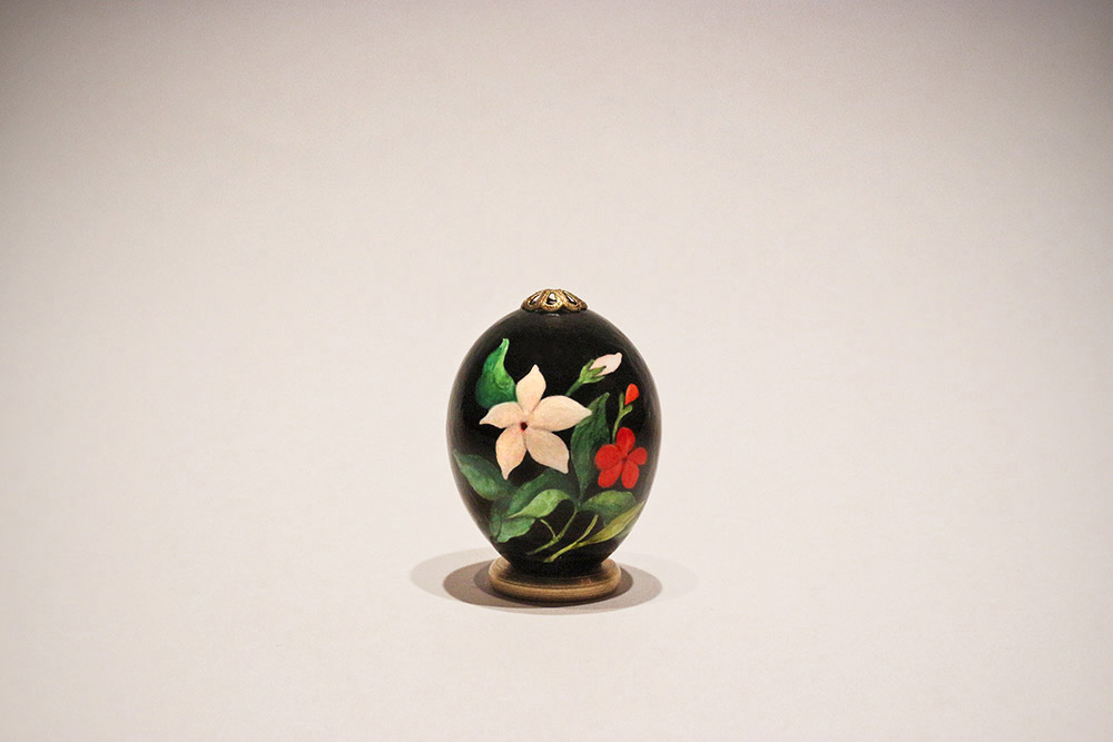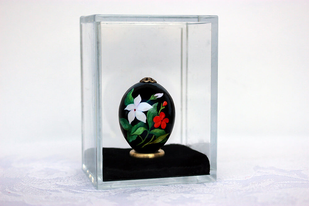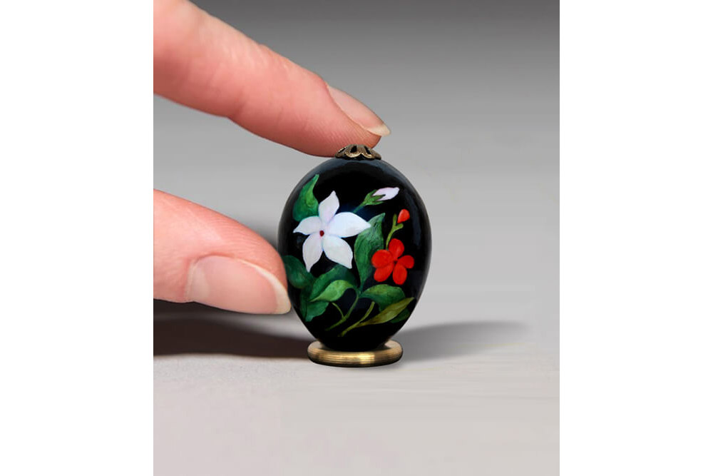 The design is inspired by a pietra dura motif. The egg is glued and standing on a bronze ring and presented on a miniature acrylic box. It is sealed with a coat of crystal clear UV resistant varnish.