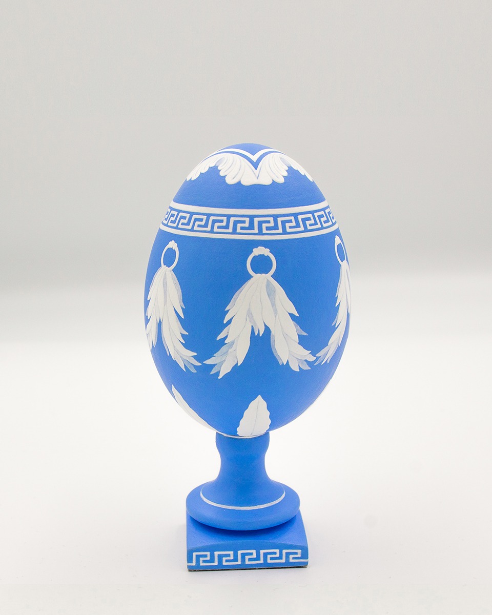 Legio VI Victrix is a hand painted goose egg depicting ancient Greek and Roman decorations. Painted with acrylics, is part of the collection Kyanomorpha.