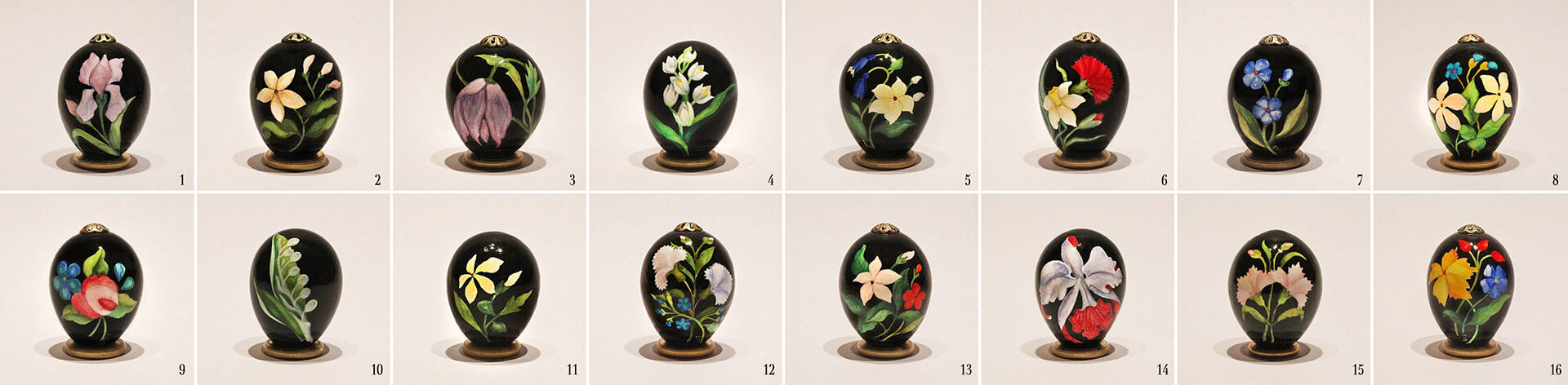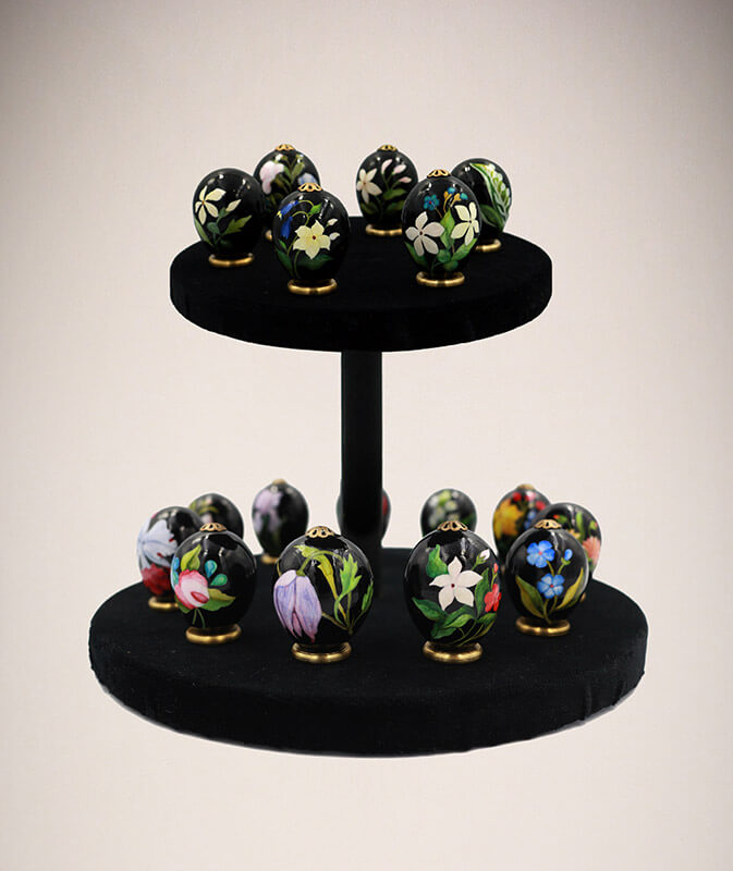 Choose from my collection of painted quail eggs inspired by pietra-dura motifs. The eggs are secured on a bronze ring and presented on a miniature acrylic box. It is sealed with a coat of crystal clear UV resistant varnish.