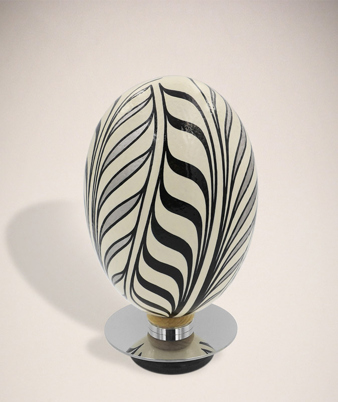 This egg is inspired by a murano-glass desk lamp. It is sealed with crystal clear UV resistant varnish. The stand is made from wood and a metal disk.