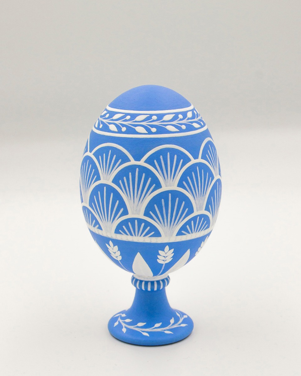 Papyrus waves belongs to the collection Kyanomorpha of hand-painted eggs and depicts a papyrus pattern inspired by ancient Greek and Egyptian reliefs and painted with acrylics.