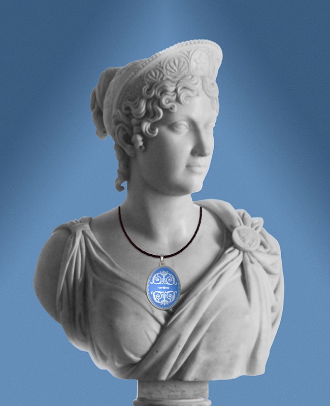 This eggshell-pendant, inspired by ancient Greece artifacts, is part of the collection of  ostrich eggshell pendants. A unique hand-painted small treasure for your jewellery collection. This piece will drive you to explore myths and artworks of the past.