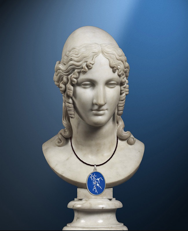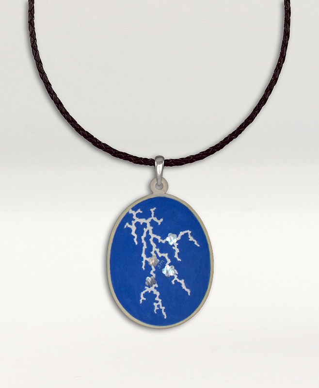 Hand-painted ostrich eggshell pendant, acrylic colour over gesso, mother-of-pearl inlay, leather cord.