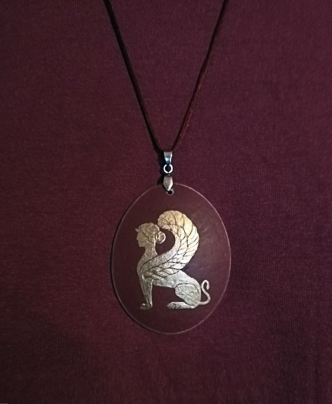 This eggshell-pendant, inspired by the Greek Sphinx myth is a unique hand-painted small treasure for your jewellery collection.