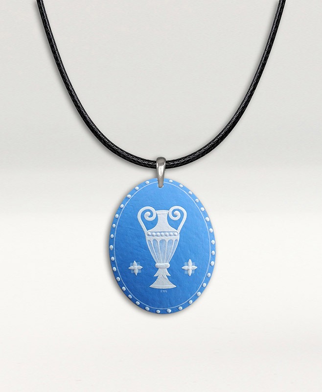 This eggshell-pendant, inspired by ancient Greece artifacts, is part of the collection of  ostrich eggshell pendants. A unique hand-painted small treasure for your jewellery collection.