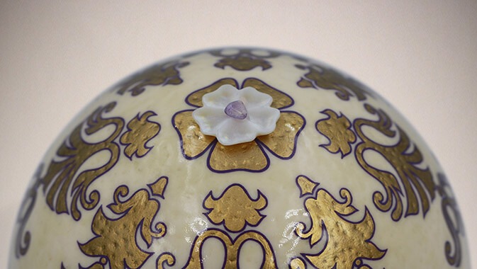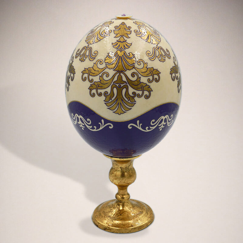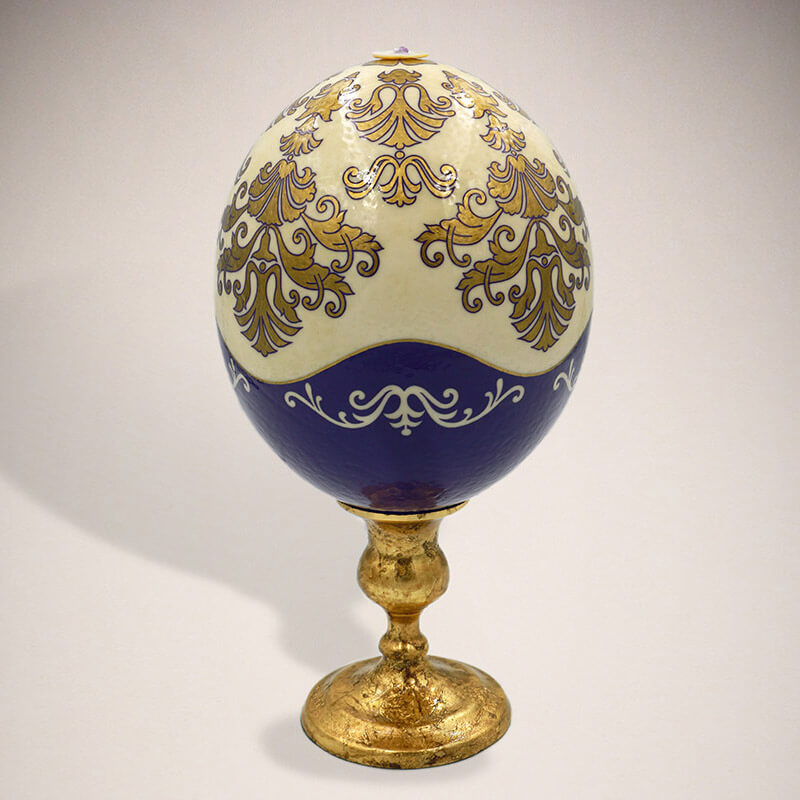 Ostrich egg decorated with Rococo motifs in mixed media. The egg is mounted on a bronze pedestal and toped with a carved mother-of-pearl flower with amethyst center. It is sealed with a coat of crystal clear UV resistant varnish.