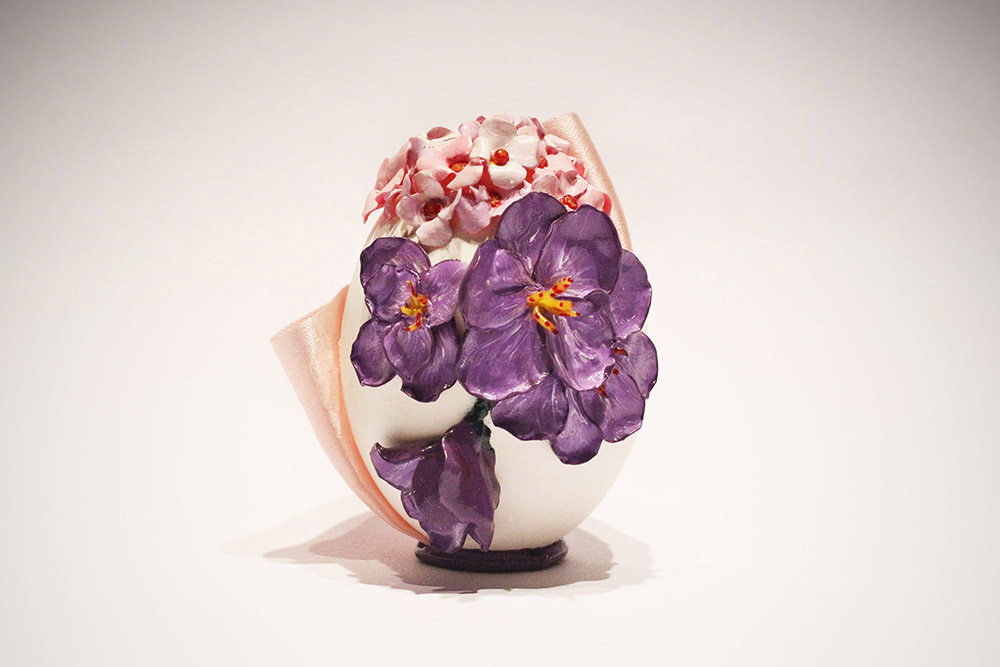 Hen eggshell, decorated with polymer clay and hand painted with acrylics.