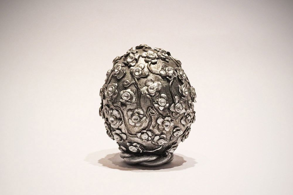 The spring has frozen and created a silverish terra firma. The sculpted parts of this egg are made out of polymer clay, so is the twisted base ring. Painted with acrylic silver paint and Indian ink, sealed with clear UV resistant varnish.