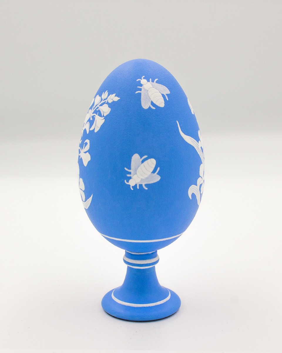 Sweet honey, sweet notes belongs to the collection Kyanomorpha of painted eggshells. On this goose egg, flowers of Eruca vesicaria and flying bees are painted with acrylics.