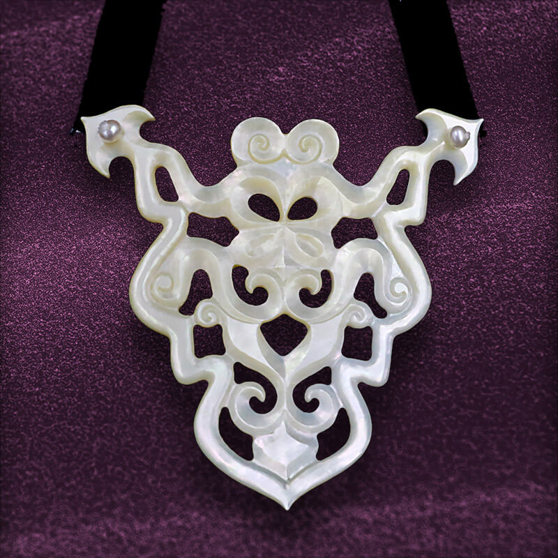 A hand-carved triangular mother-of-pearl pendant on velvet ribbon, secured with small pearls.