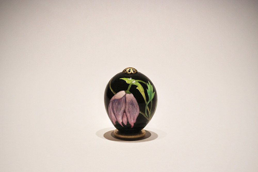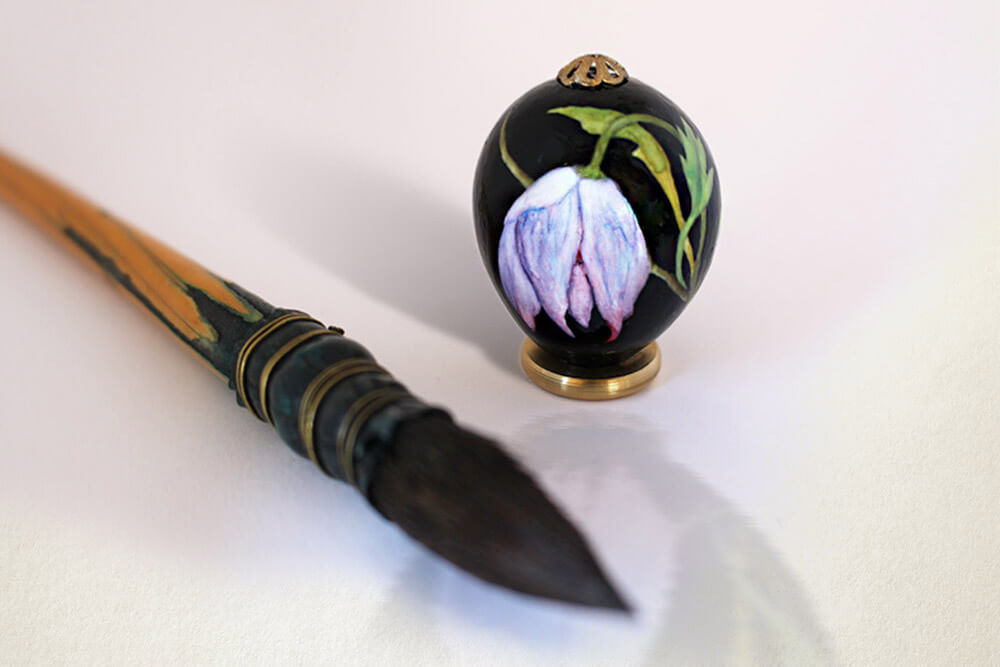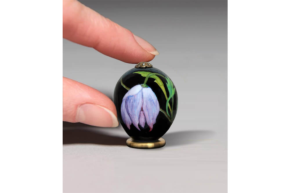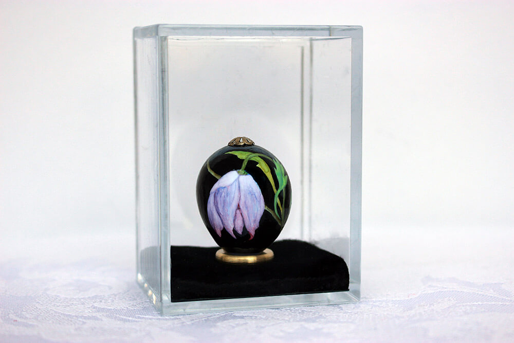 The design is inspired by a pietra dura motif. The egg is glued and standing on a bronze ring and presented on a miniature acrylic box. It is sealed with a coat of crystal clear UV resistant varnish.