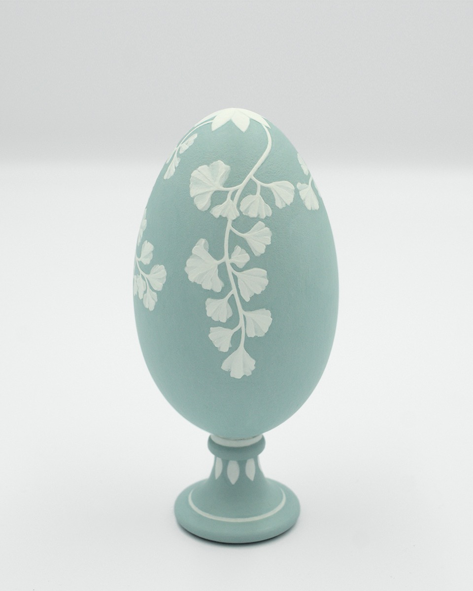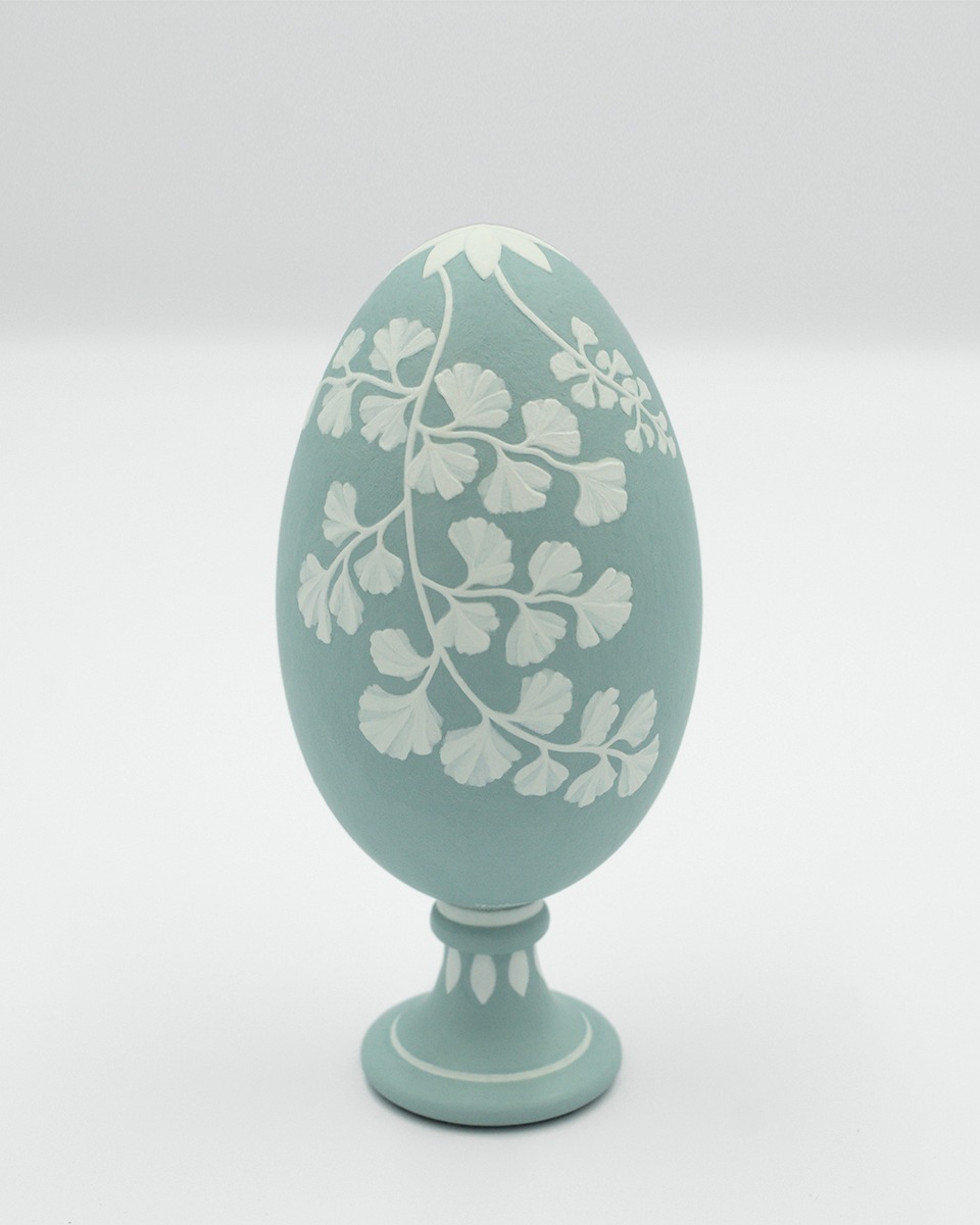 Under the sea, over the fell belongs to the collection Kyanomorpha of hand-painted eggs. On this goose egg, garlands of ginkgo are painted with acrylics on pale green ground.