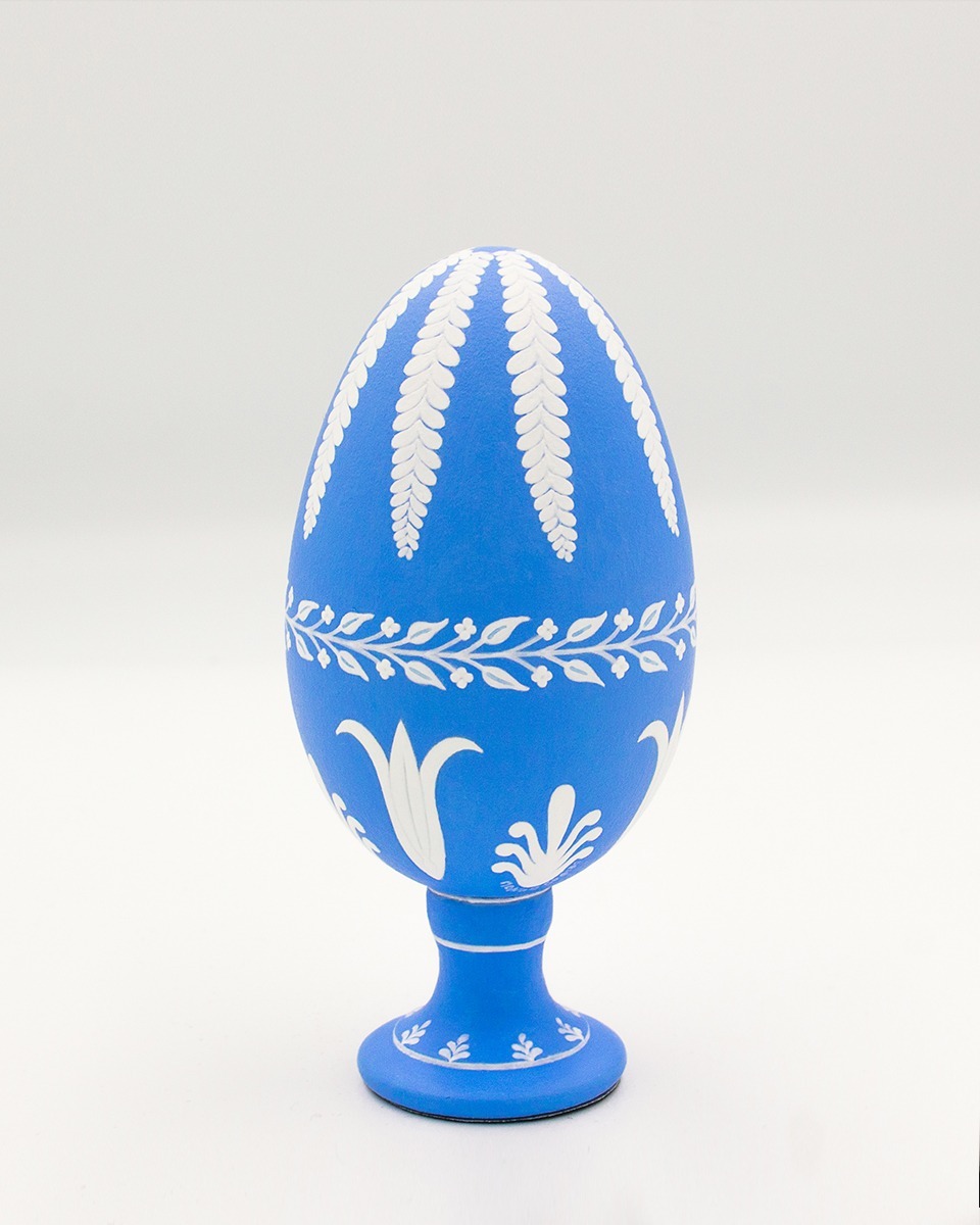 Water fountain belongs to the collection Kyanomorpha of decorative eggshells. This goose egg is adorned with floral patterns inspired by ancient Greek ornaments and is painted with acrylics.