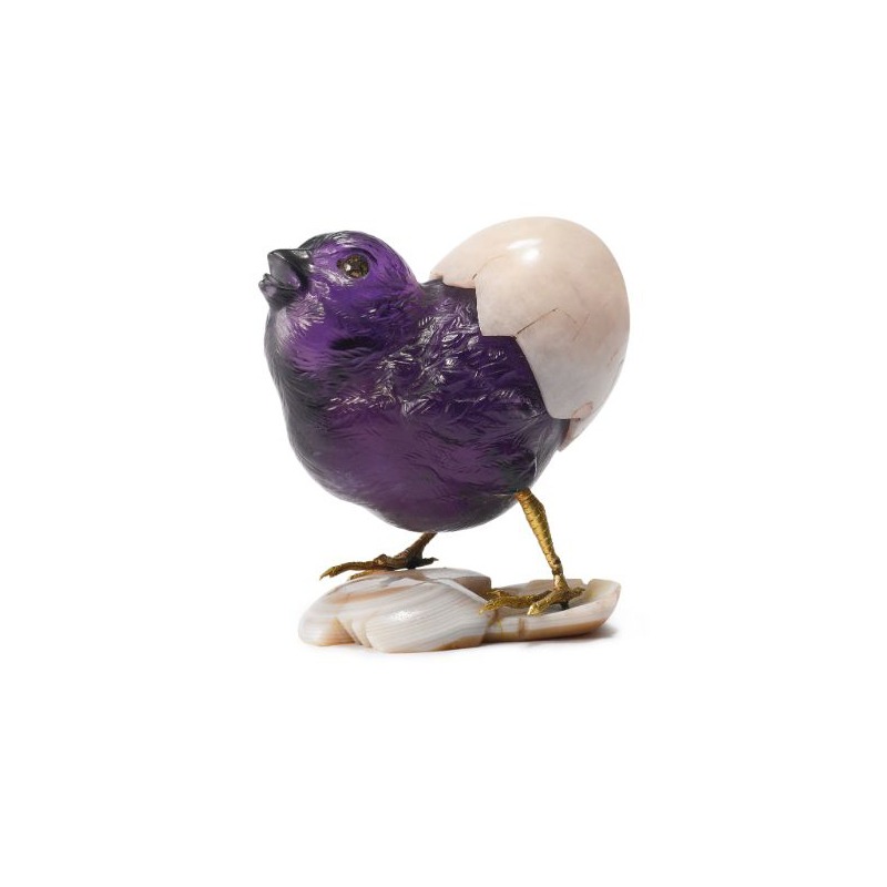 A gold, hardstone and gem-set model of a hatching chick finely carved of solid amethyst with ruffled feathers emerging from a chalcedony cracked shell, realistically chased gold feet standing on broken eggshell agate base, with faceted gem set eyes. The purple chick is probably meant to represent the “blue orpington” breed.